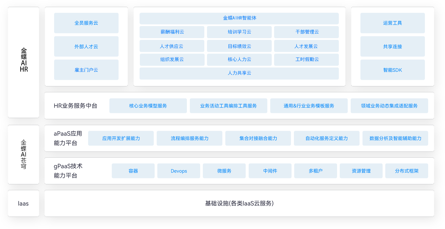 金蝶AI HR融汇华为全球人力资源管理先进实践与金蝶在HR SaaS领域的深厚积累,以可组装企业级PaaS平台——金蝶AI苍穹为技术底座,助力成长型企业和大型企业打造精益运营、数据驱动的人力资源管理体系,可稳定支撑超百万员工规模下的高效人力资源业务处理。区别于传统以HR职能为中心的产品设计,金蝶AI HR始终以业务场景为驱动,着力化解企业“人力资源和业务两张皮”的现状困局,实现业人一体。凭借前瞻的顶层设计、强大的平台性能与深刻的业务洞察,金蝶AI HR正成为AI时代企业人力资源管理的优选伙伴。