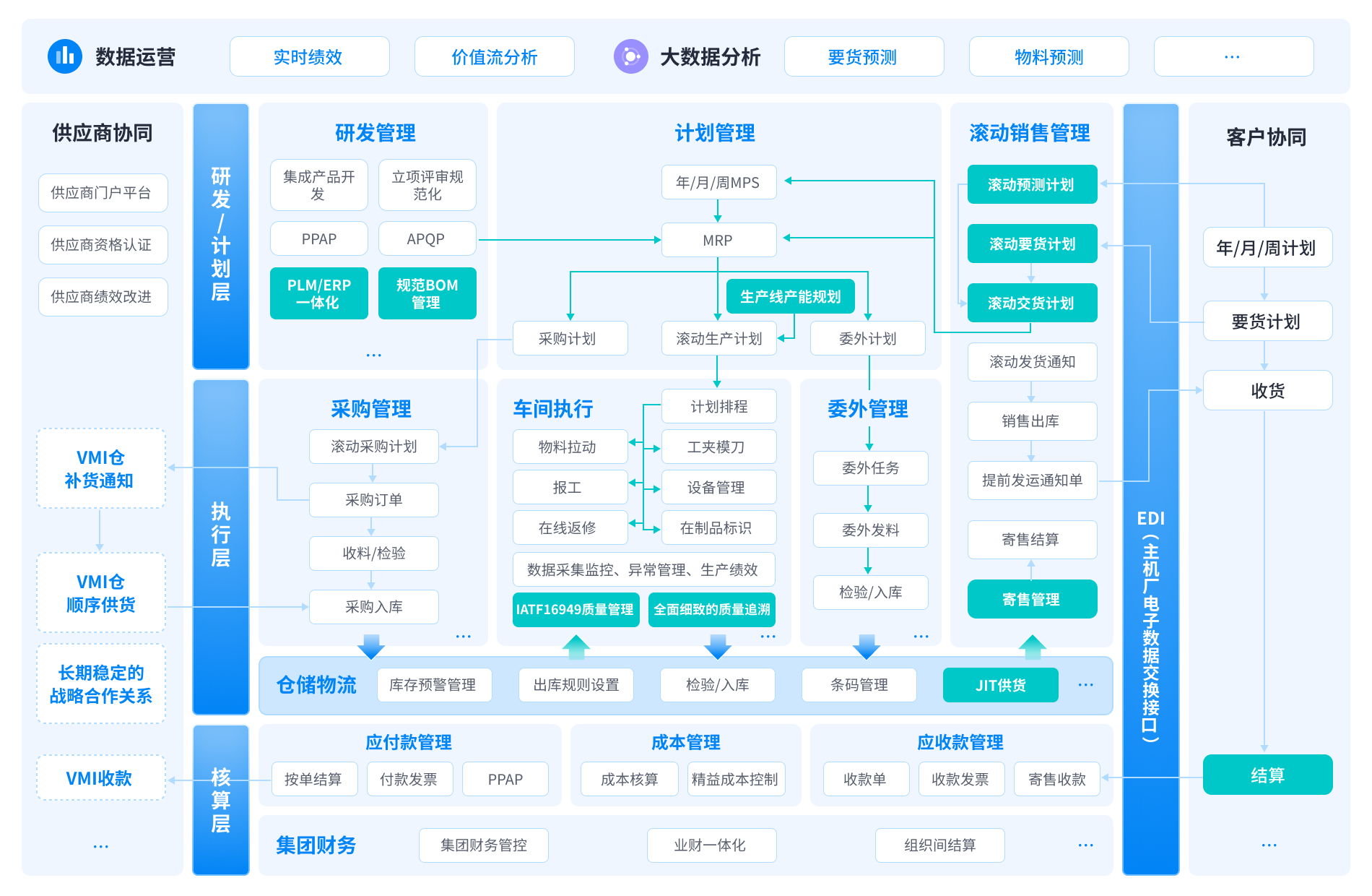 通过EDI和滚动销售,实时获取客户滚动需求并生成滚动交货计划,确保准时发货;通过VMI采购和采购协同,实现供应商JIT送货,构建符合MMOG/LE体系要求的JIT供应链,最优化自身库存。