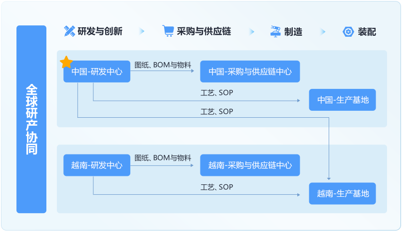 研发、销售、供应链、财务、生产运营全场景业务流程,拉通全球产业链内部的协同