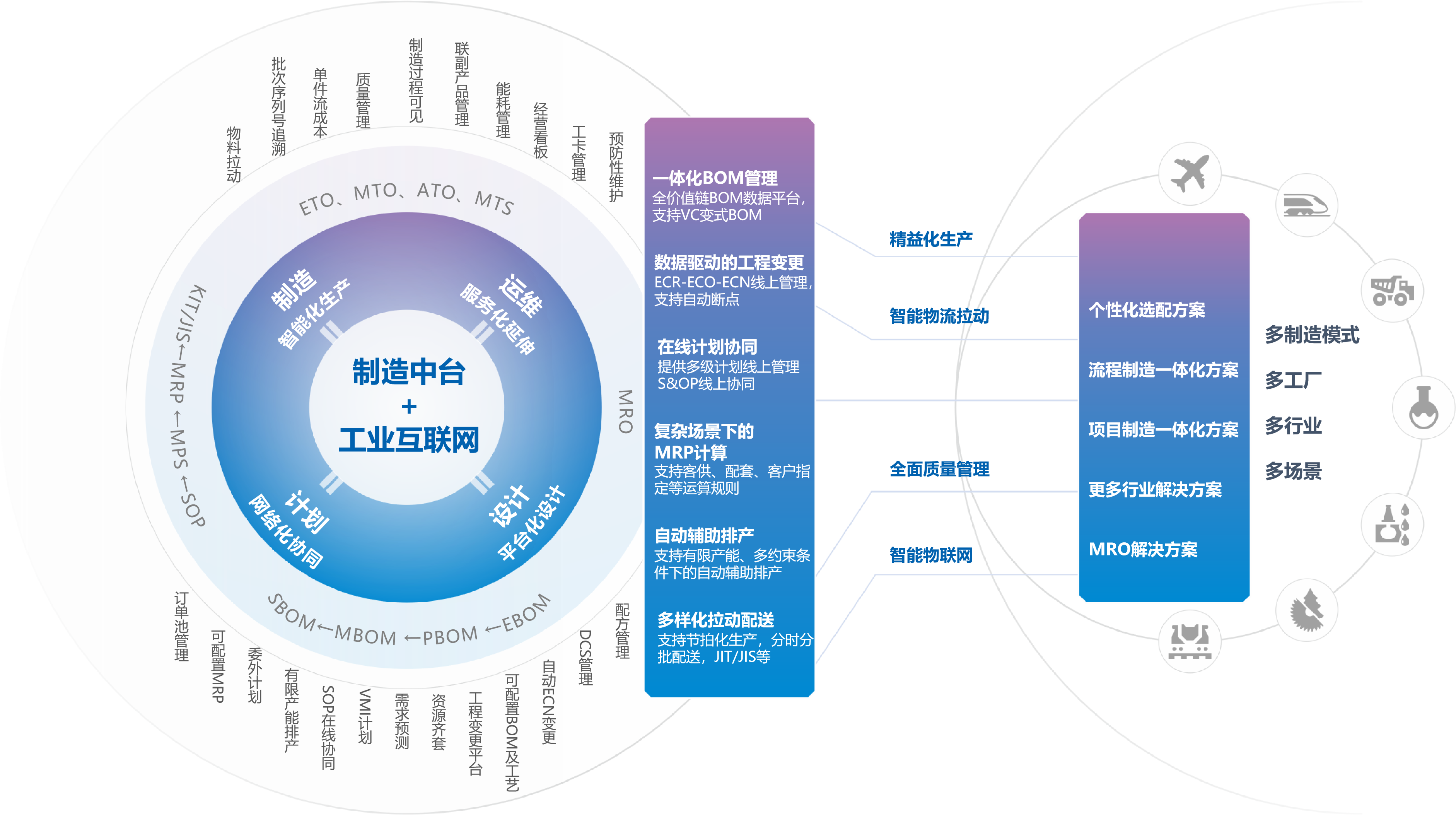 支持MTS、ATO、MTO、ETO多种制造模式混合使用,融合精益计划体系、现场精益制造执行、拉式生产、精益物流、智能Andon 、在线质检、设备运维、数字运营等核心应用,适配多行业需求